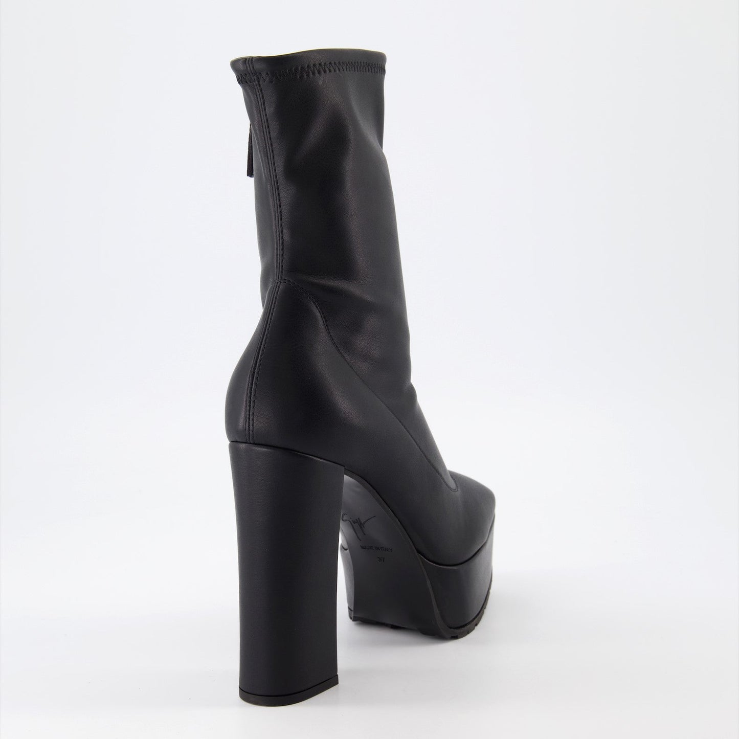 Indulge in pure elegance with the Morgana Heel Boots by Giuseppe Zanotti, designed exclusively for women who appreciate the epitome of luxury. These exquisite boots feature an alluring black leather finish that exudes sophistication, seamlessly aligning with the chic and refined aesthetic of high fashion.