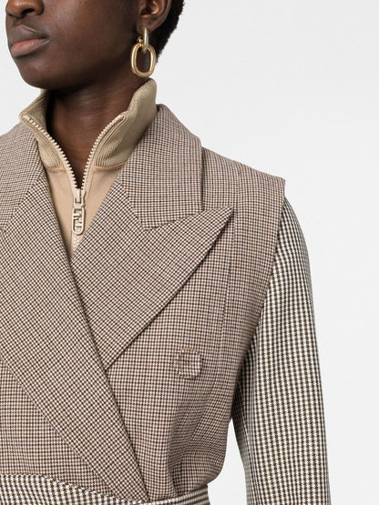 Stand out with this houndstooth print multi-layer jacket from Fendi for Women. Featuring a high collar and long sleeves, this double-breasted blazer jacket is both elegant and functional. The removable Fendi O'Lock pocket adds a practical touch while staying true to the brand's high-end aesthetic. Perfect for complementing your wardrobe with a signature piece that combines tradition and modernity.