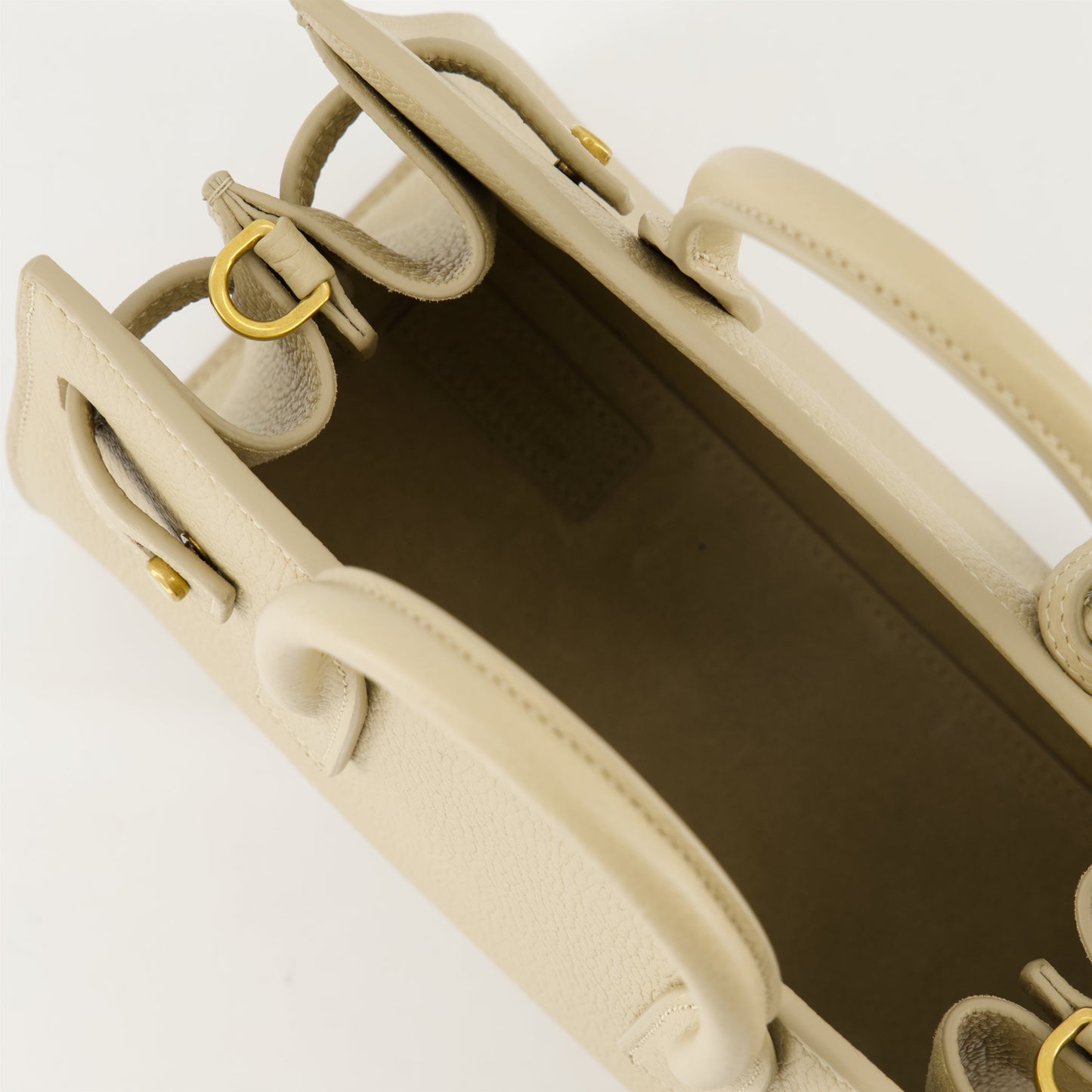 The Nano Beige Day Bag from Saint Laurent is a refined accessory that encapsulates contemporary style. Designed without closures, it offers an effortlessly chic look. The adjustable and removable shoulder strap ensures versatility, while the fixed handle provides a classic touch. Crafted from high-quality grained leather in a warm beige hue, this bag features a luxurious gold-tone hardware logo and a practical interior with card slots. The removable lock with leather case adds a hint of sophistication to this essential piece. Perfectly suited for the modern individual, this bag is a must-have addition to your collection.
