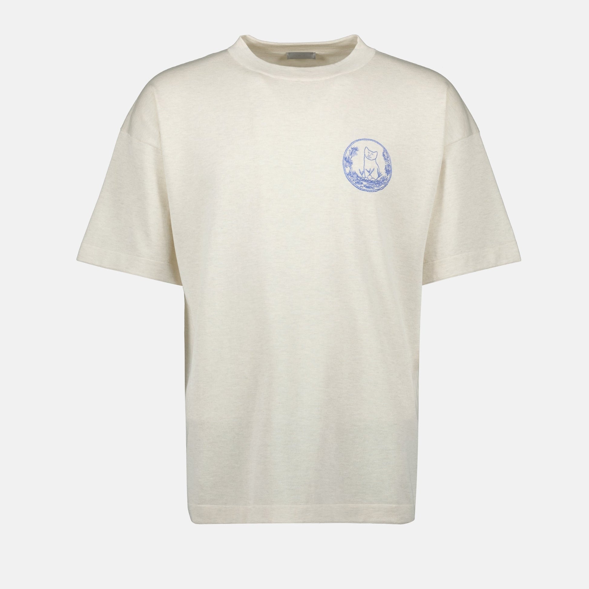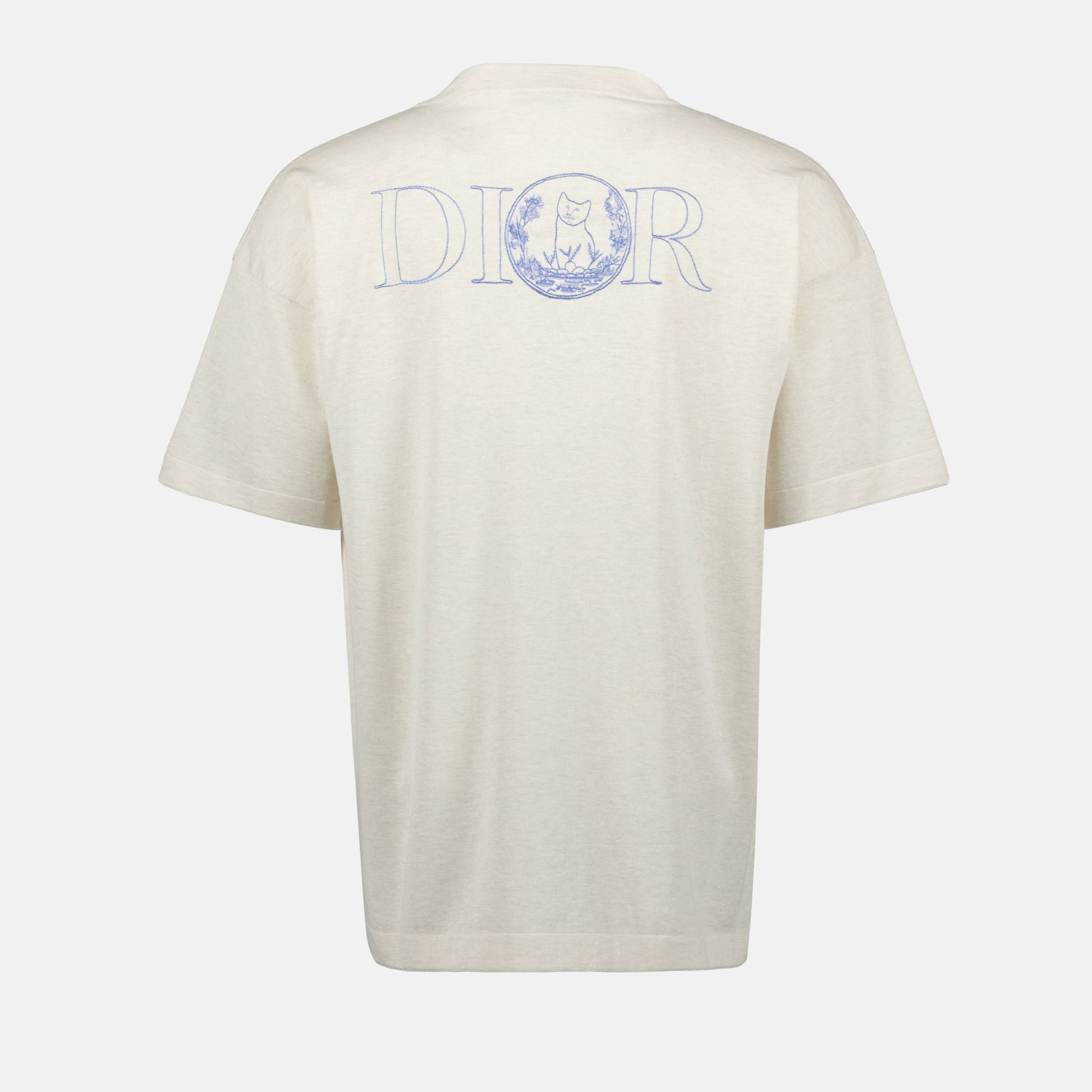Elevate your collection with this oversized knit T-shirt from the collaboration of Dior and Hylton Nel. Crafted in soft knit and silk blend, this beige T-shirt features a classic crew neck and short sleeves, making it a versatile staple for various occasions. The standout detail is the striking red Ami de cœur logo embroidered on the chest, adding a touch of artistry to the design. This piece showcases exquisite craftsmanship, with additional embroidery on both front and back, symbolizing the synergy of two iconic brands. Whether styled for a casual outing or a relaxed day at home, this T-shirt embodies effortless sophistication.