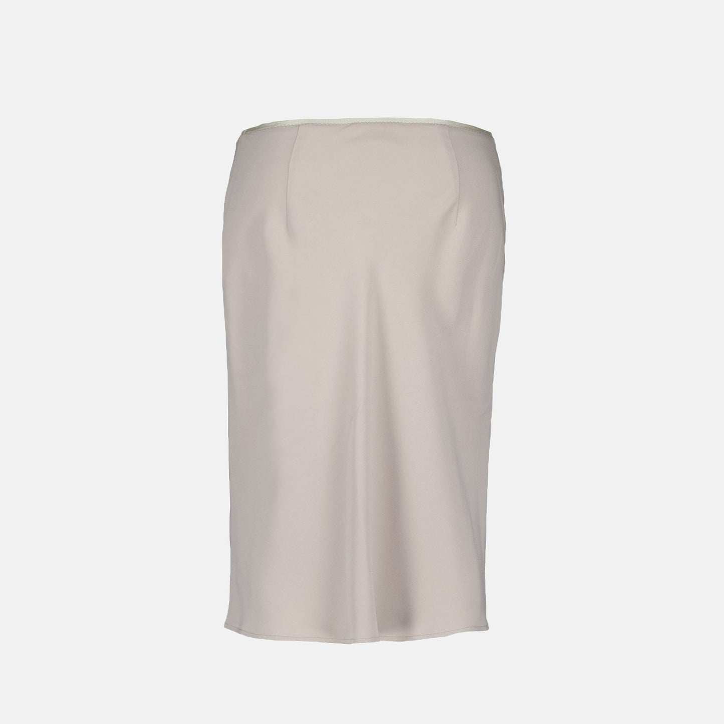 Embrace timeless elegance with the beige viscose midi skirt from AMI Paris. Crafted from luxurious viscose, this skirt showcases a flattering midi length that enhances your silhouette with effortless grace. The refined beige hue delivers a versatile and sophisticated appeal, making it a staple piece for any high-end wardrobe. Whether paired with a chic blouse or a tailored jacket, this skirt promises to elevate your style quotient while providing unmatched comfort and quality.
