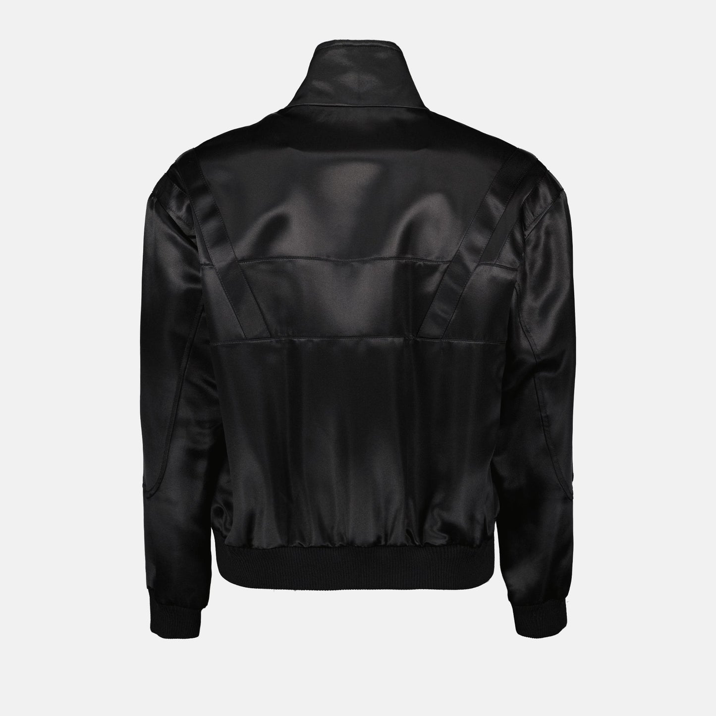 Embrace timeless elegance with the Satin Bomber Teddy jacket by Saint Laurent. A masterpiece in craftsmanship and design, this jacket seamlessly fuses a classic bomber silhouette with the sleekness of satin material. The lustrous finish of the fabric exudes sophistication, while the ribbed trims and metallic zip add a modern edge.