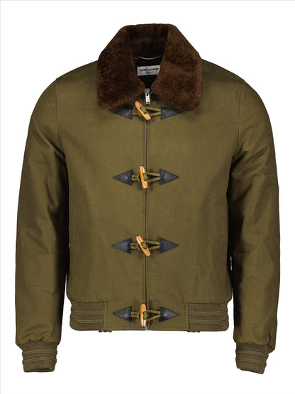Introducing the epitome of luxury and sophistication: the Shearling Collar Bomber Jacket in a striking green hue by Saint Laurent. Crafted with precision, this bomber jacket seamlessly blends contemporary fashion with classic elegance, making it an essential addition to any gentleman's wardrobe.