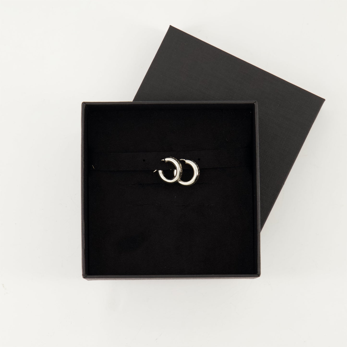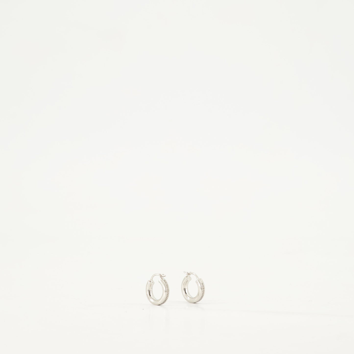 Experience the blend of elegance and contemporary style with the Silver Greca Hoop Earrings. Made from metal, these hoops are designed with a classic closure and feature an intricately engraved logo. Not only are they stylish, but they also ensure comfort with their hypoallergenic materials. Part of the exclusive Spring-Summer 2025 collection, these earrings add a touch of sophistication to any ensemble.