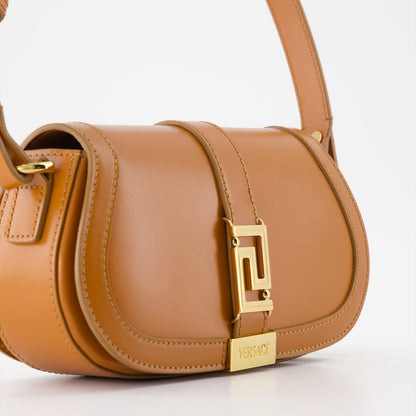 The Small Greca Goddess Bag by Versace perfectly embodies the brand's iconic elegance and sophisticated style. Crafted from smooth brown leather, this exquisite handbag is adorned with the distinctive Greca pattern, adding a touch of classic Versace opulence. Its compact size makes it a versatile accessory that complements both day and evening looks.