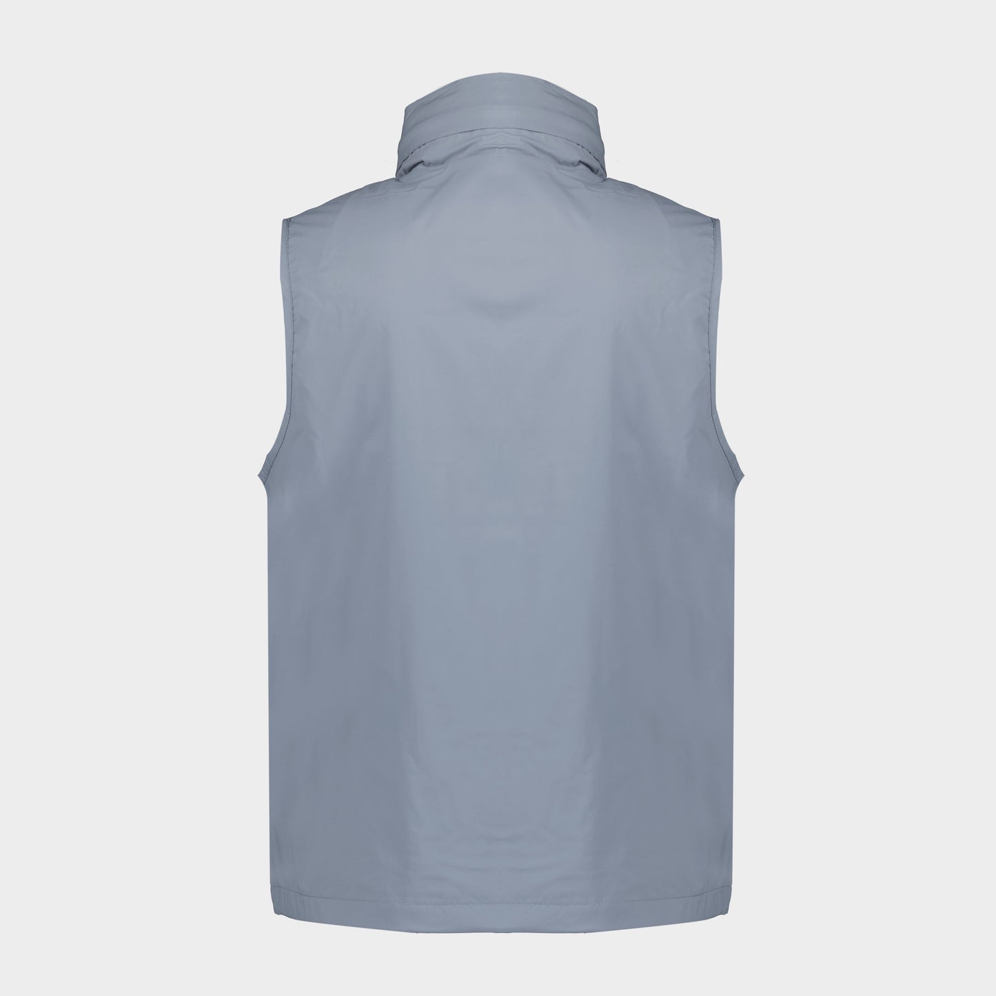 The Vallen sleeveless jacket boasts a modern aesthetic with its high collar and straight cut, making it a versatile addition to your wardrobe. Designed with a double-slider zip closure and signature silicone logo, it offers practical features like elasticized edges and side zippered pockets. The grey nylon fabric is complemented by a soft jersey cotton lining, ensuring comfort and warmth on cooler days. With thermotaped seams and a packable hood neatly stored in the collar, this piece is perfect for transitional weather. Ideal for layering, the Vallen jacket effortlessly combines style with functionality.