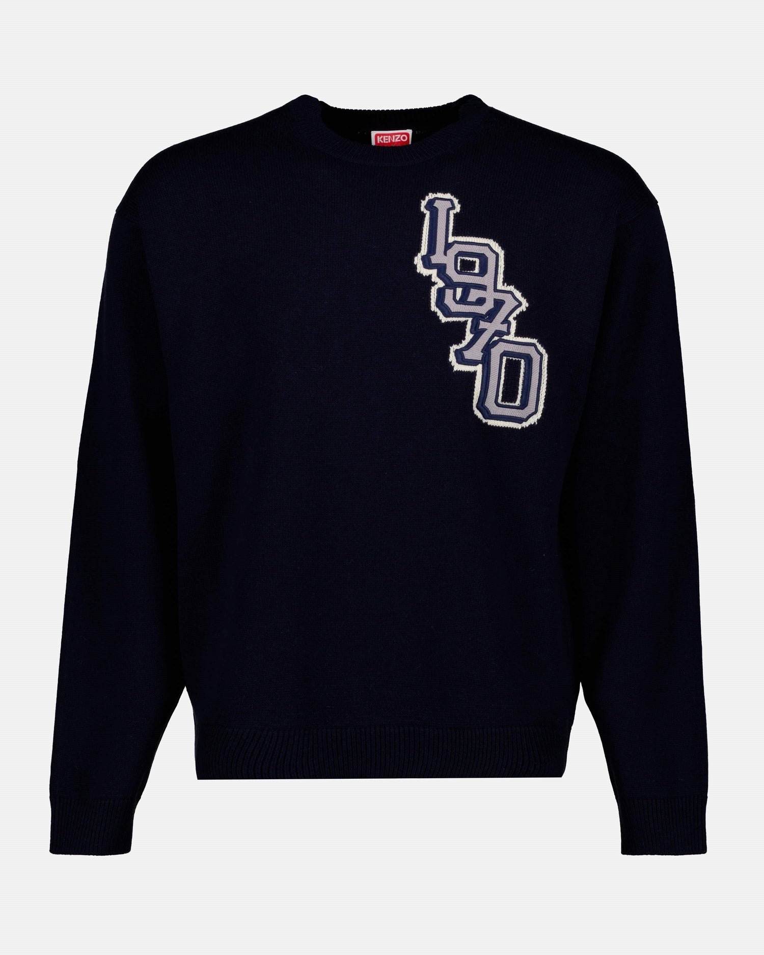 Discover the Men's Tiger Varsity Blue Sweatshirt, an exclusive creation by Kenzo that combines style and comfort. Crafted from soft wool that is pleasant to wear, this sweater features a beautifully embroidered logo for a touch of authenticity. Its straight fit, round neck, and long sleeves offer an elegant and relaxed silhouette. The ribbed edge finishes provide durability and a perfect fit. An essential addition to the men's wardrobe that will pair seamlessly with all your outfits.