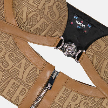 The Versace Allover Brown Bustier Top for women epitomizes luxurious elegance and modern sophistication. Featuring an intricate allover Versace pattern, this exquisite bustier is designed to accentuate the female form with its flattering silhouette and structured design. The rich brown hue gives a timeless appeal, making it versatile for various occasions whether paired with tailored trousers or a chic skirt. Expertly crafted from premium materials, this bustier ensures comfort while exuding opulence, staying true to Versace's hallmark of top-tier fashion. Dare to make a striking impression with this stunning piece from one of the most prestigious fashion houses.