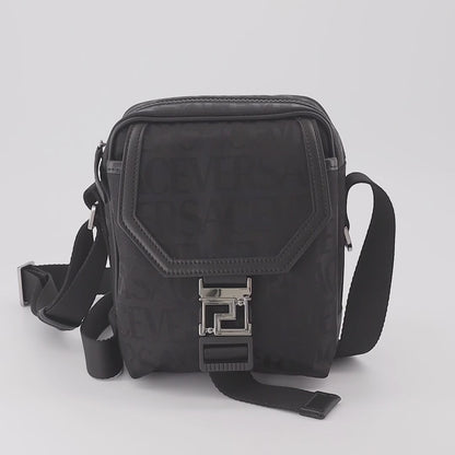 Introducing the Versace Allover Crossbody Bag for men, a statement piece exuding timeless elegance and sophistication. This luxury accessory embodies the iconic Versace aesthetic with an intricate black pattern, meticulously crafted to complement your upscale wardrobe.