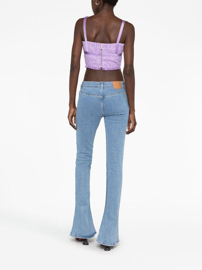 Perfect for making a fashion statement, this Versace bustier can be styled effortlessly for both daytime and evening occasions. Its vibrant violet color complements a range of skin tones, ensuring you look your best at all times. Elevate your fashion game with this extraordinary offering from one of the most prestigious names in luxury fashion.
