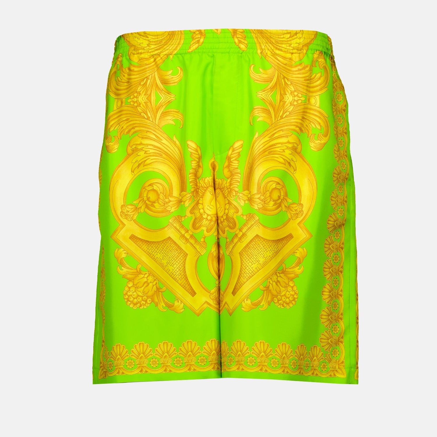 Elevate your wardrobe with the luxurious Versace Barocco 660 silk shorts for men. Exquisitely crafted from the finest silk, these shorts feature the iconic Barocco pattern, a signature of Versace's timeless elegance and sophisticated design. The intricate gold detailing against the rich dark fabric enhances its opulent appeal, making it a perfect choice for those who appreciate high fashion. Ideal for both upscale casual and formal settings, these shorts are a statement piece that promises comfort without sacrificing style. Immerse yourself in the unparalleled luxury of Versace with the Barocco 660 silk shorts and embrace a look that exudes confidence and elegance.