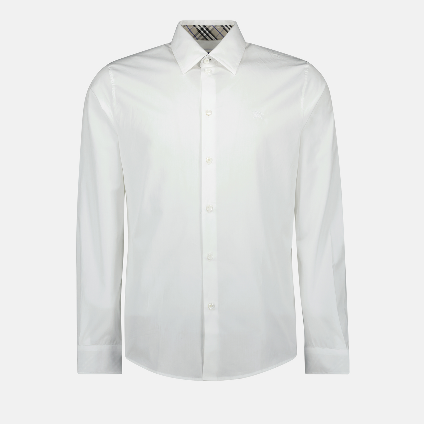 This white cotton shirt by Burberry is a sophisticated addition to any wardrobe. Crafted from fine cotton, it features a classic collar and long sleeves, with a straight cut for a timeless silhouette. The shirt boasts a button-up closure and is adorned with a subtly embroidered logo at the front. The collar highlights a delicate check pattern that adds a touch of signature style without overwhelming the clean design. Perfect for both formal occasions and casual outings, this shirt exemplifies effortless refinement.