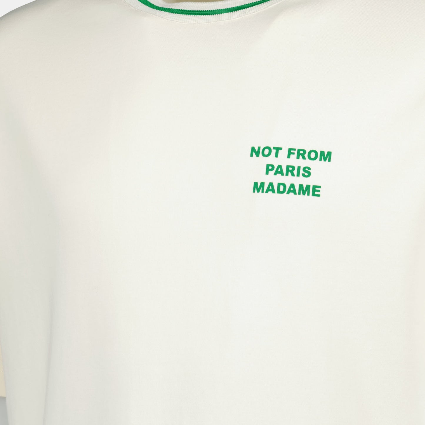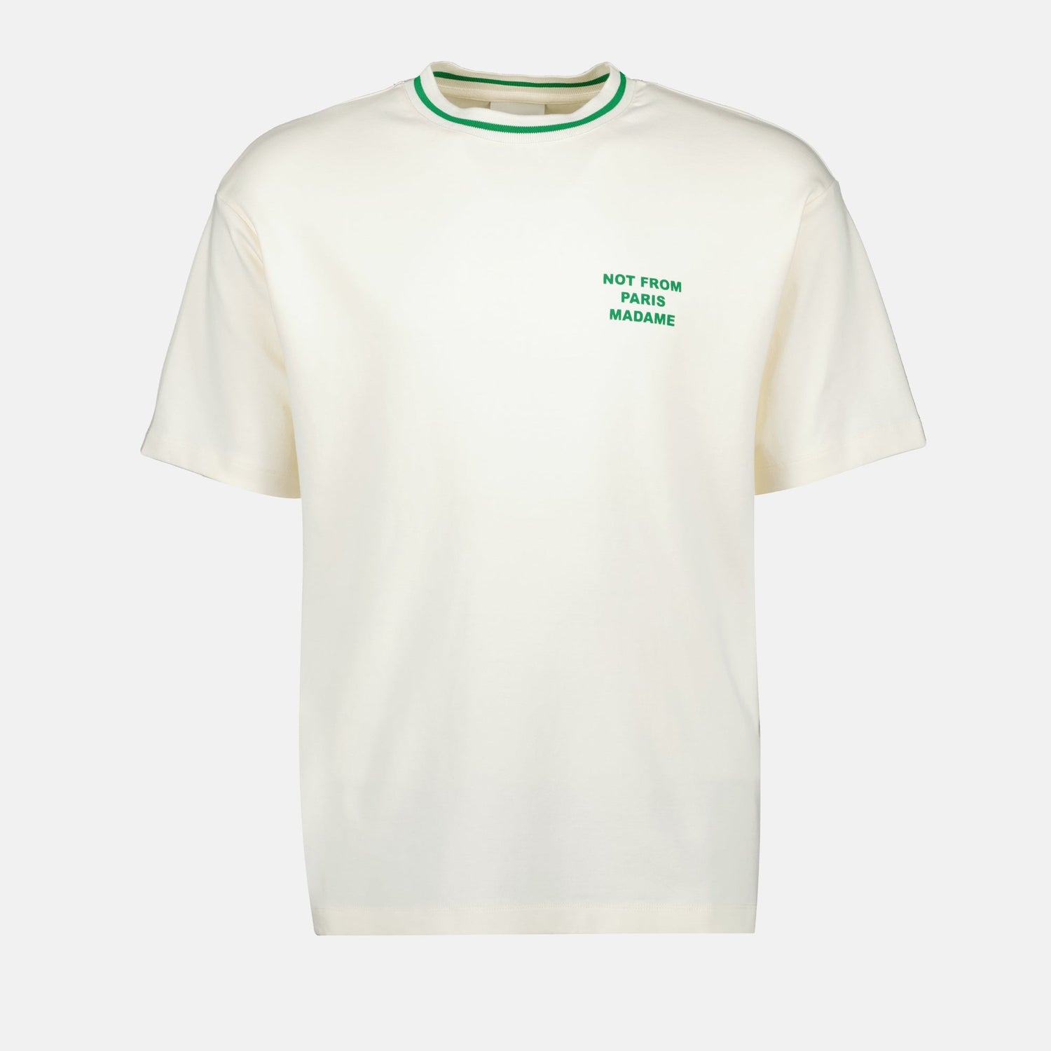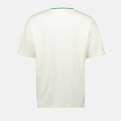 Introducing a stylish white and green slogan t-shirt designed with a round neckline and short sleeves, presenting a relaxed fit ideal for everyday wear. The contrasting ribbed collar adds a stylish detail to this ensemble. Made from high-quality cotton, this piece guarantees comfort and breathability, making it suitable for warm seasons. The printed logo offers a modern touch, perfect for those who appreciate a laid-back yet trendy aesthetic.