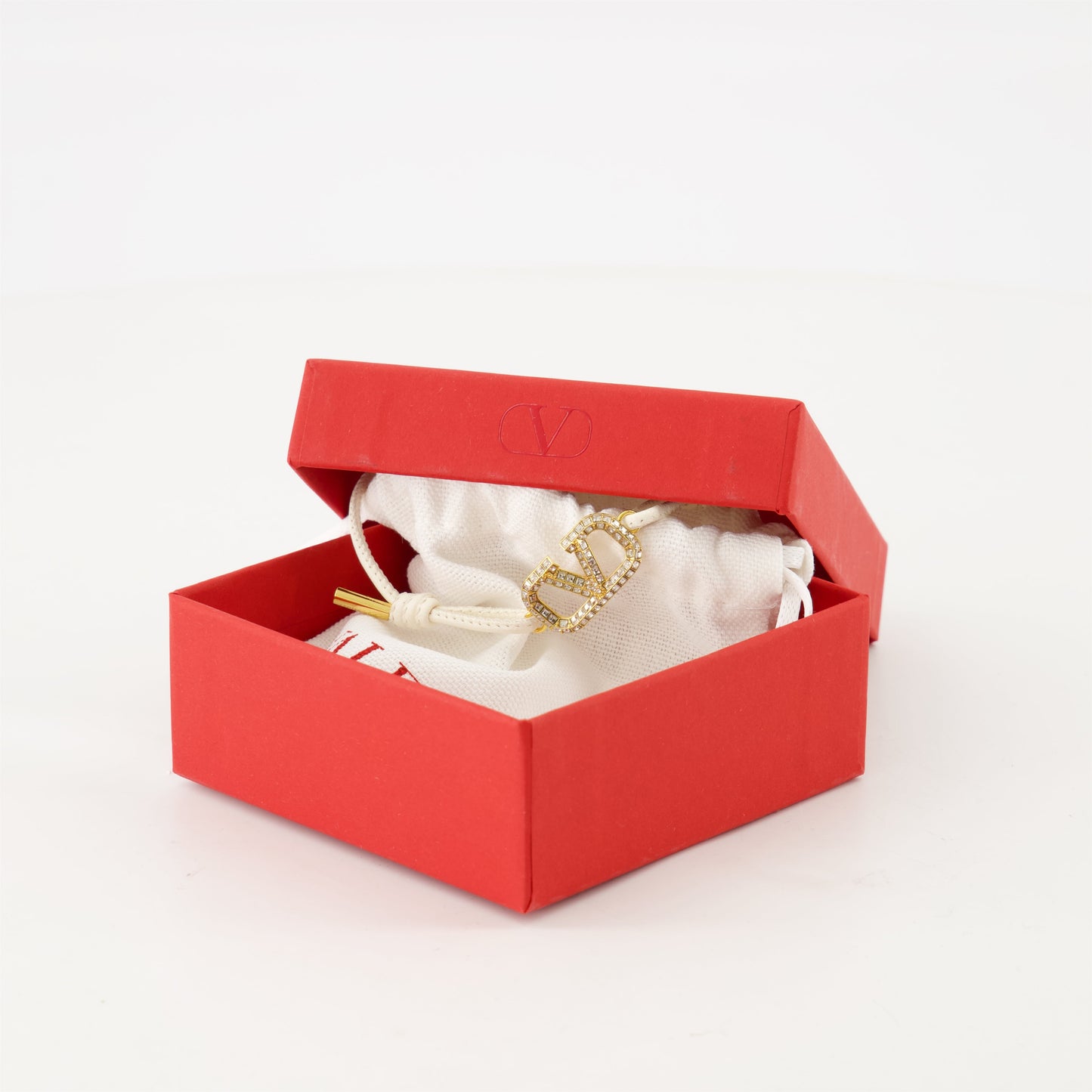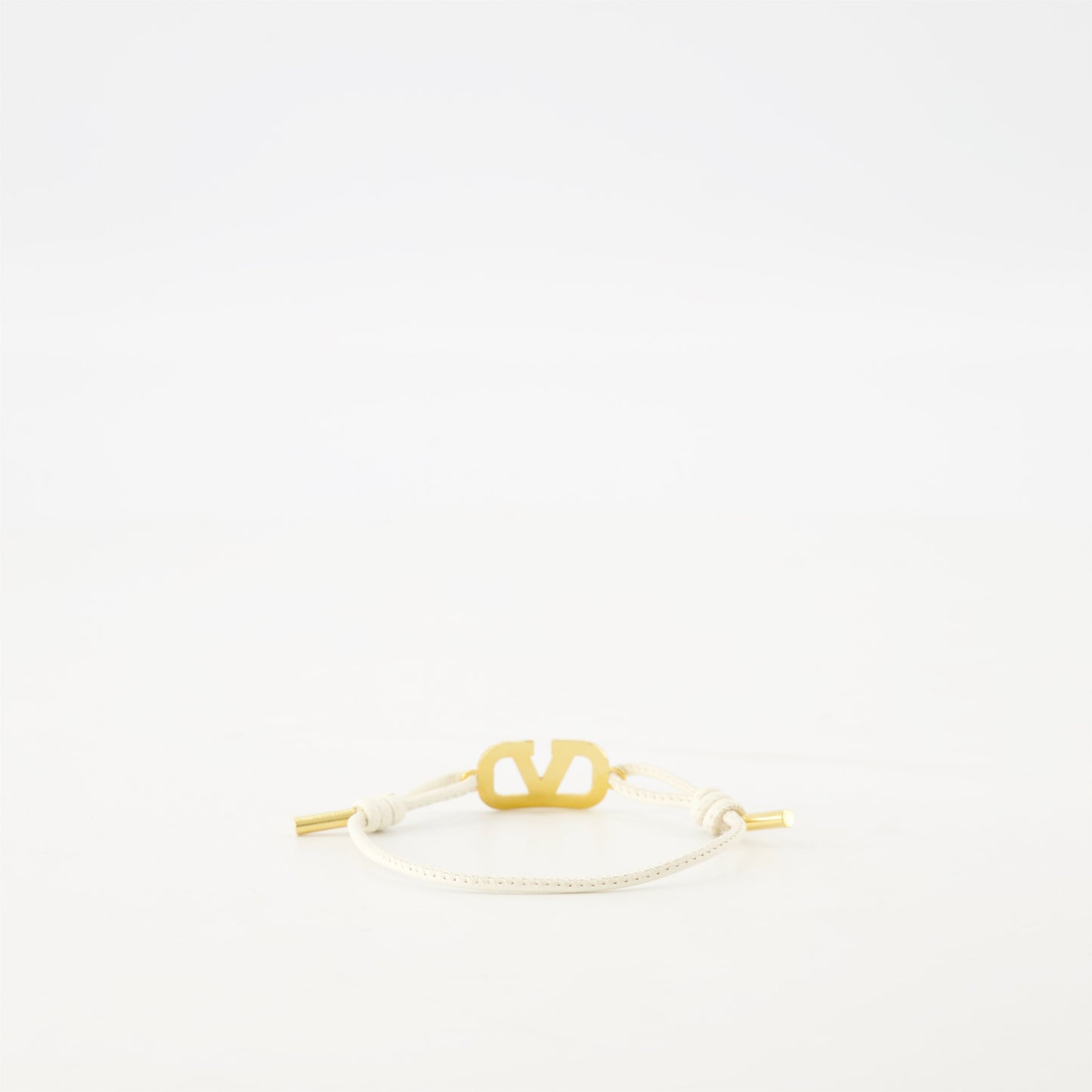Immerse yourself in refined style with the White Leather Cord Bracelet featuring the iconic VLogo. Crafted from supple lambskin leather and metal, this bracelet is embellished with shimmering Swarovski crystals, offering a sleek and contemporary design. Its cord closure ensures a tailored fit for comfort and elegance, making it a versatile addition to your accessory collection. Indulge in subtle luxury with this exquisite piece from the Valentino Garavani collection, perfect for enhancing any outfit with its understated brilliance.