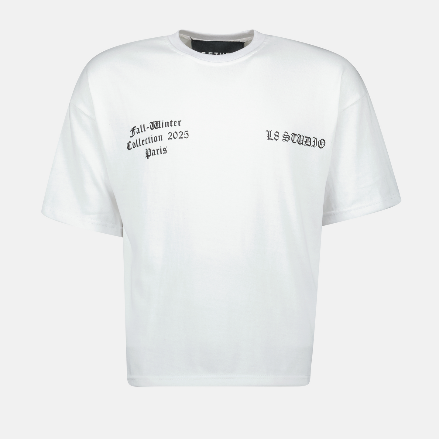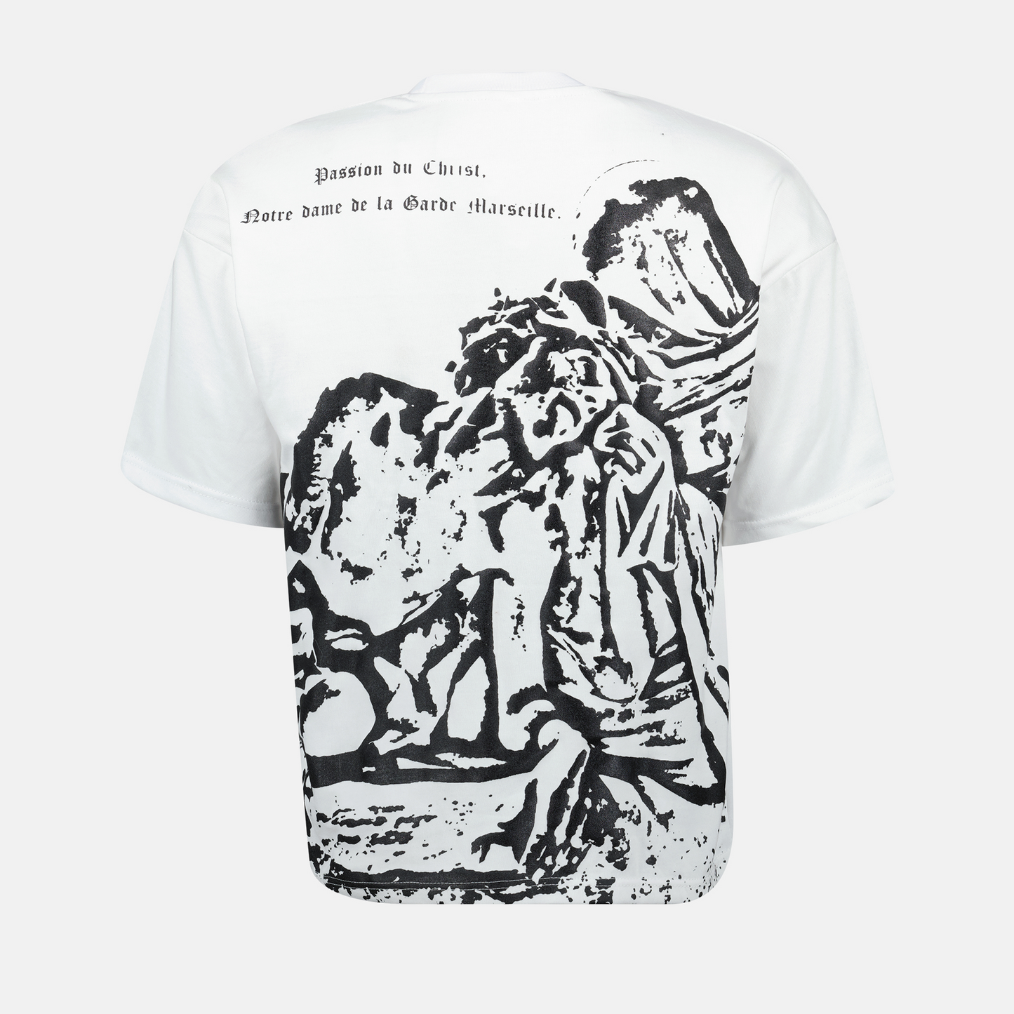 Elevate your casual wardrobe with this White Passion du Christ T-shirt, showcasing an eye-catching print on the back that captures a unique message. Featuring a comfortable round neckline and short sleeves, this oversized piece is crafted from soft cotton, ensuring breathability and ease throughout the day. This model is part of the Spring-Summer 2025 collection, making it an ideal addition to your seasonal attire. Its minimalist design and modern cut lend versatility for various styling opportunities, seamlessly transitioning from relaxed daywear to an easy evening look.