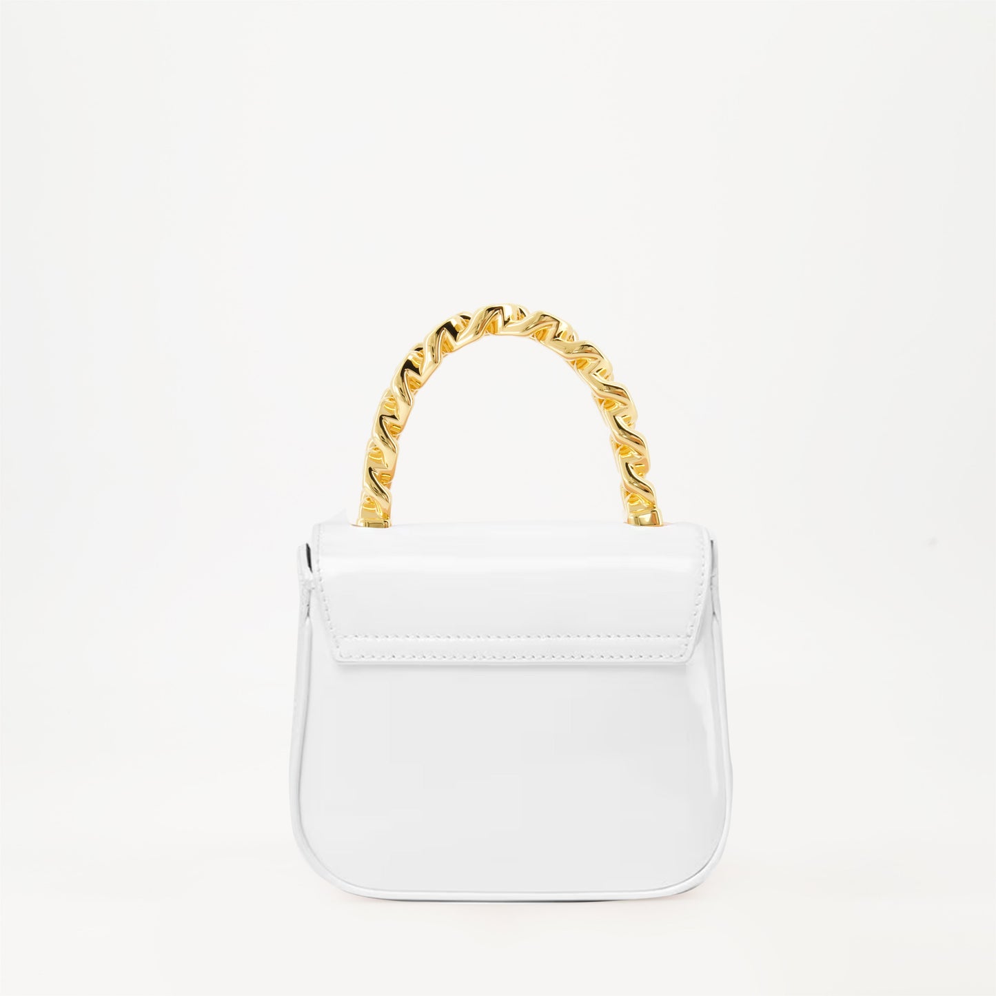 Introducing the exquisite La Medusa Mini Bag from Versace's Spring-Summer 2024 collection. Crafted in pristine white patent leather, this statement piece radiates sophistication and elegance. It features a fixed chain handle, adding a touch of glamour, and a detachable leather strap for versatile styling options. The iconic Medusa head emblem adorns the front, making it instantly recognizable and a must-have for any luxury wardrobe.