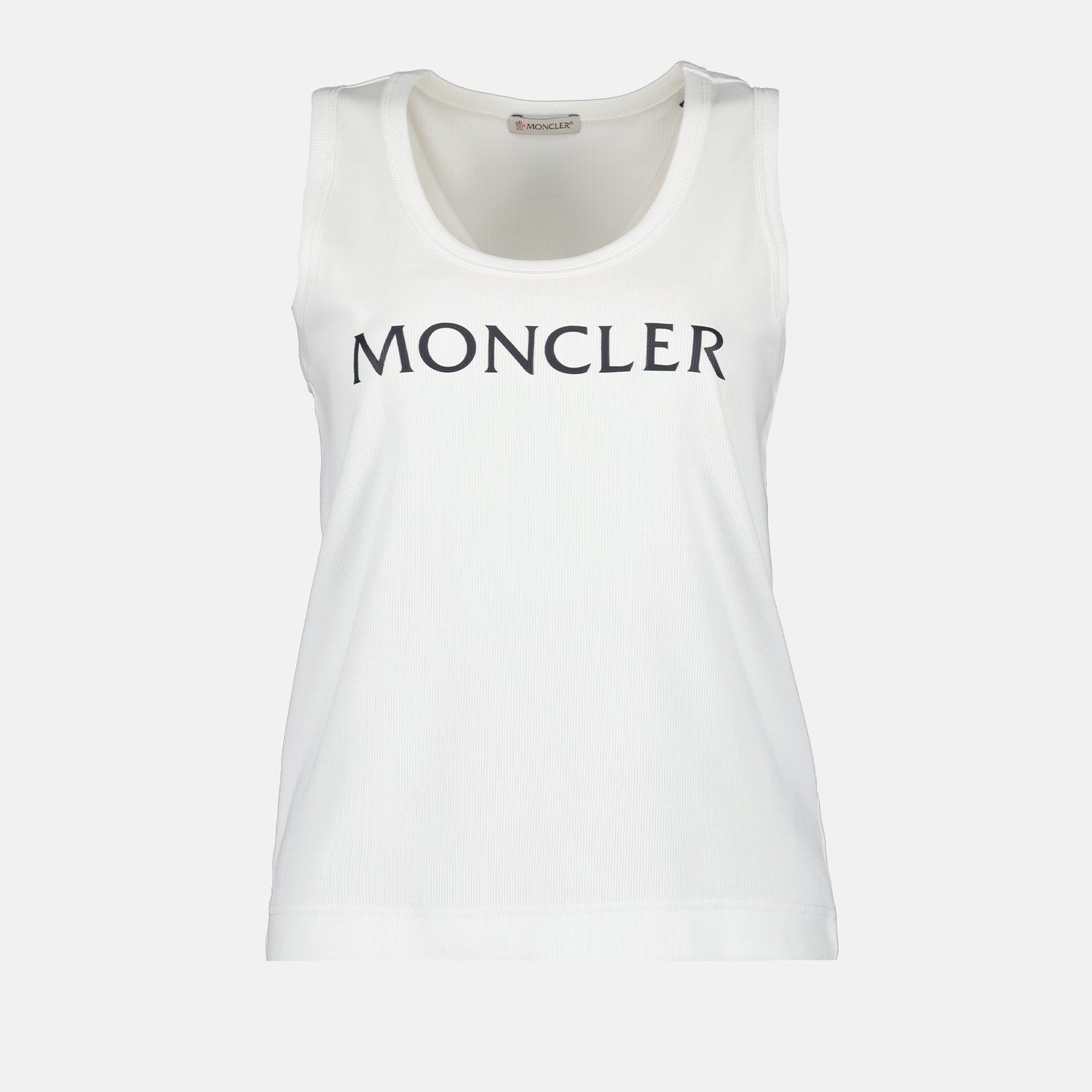 Introducing the Women's White Logo Tank Top by Moncler, a masterpiece of luxury ready-to-wear. This tank top presents an impeccable white hue, adorned with the signature Moncler logo, embodying the essence of sophisticated simplicity. The premium fabric ensures a comfortable and flattering fit, perfect for any casual or upscale occasion. Elevate your wardrobe with this timeless piece, offering a seamless blend of style and elegance synonymous with Moncler. Ideal for women who appreciate the finer things in life, this tank top is a statement of both luxury and refined taste.