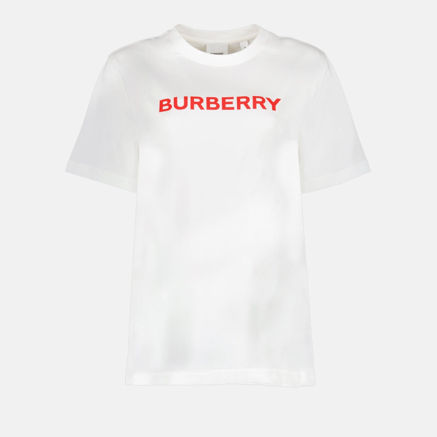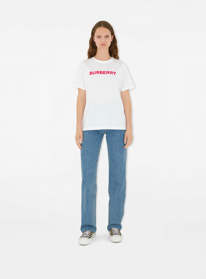 Elevate your wardrobe with the epitome of luxury, the Burberry Women's White Logo T-shirt. Expertly crafted, this T-shirt offers a minimalist yet striking design featuring the iconic Burberry logo prominently displayed on the chest. The pristine white fabric provides a versatile canvas, effortlessly pairing with any outfit, whether you're dressing up or down. The back mirrors the front's elegance, emphasizing the shirt's refined simplicity. Impeccable details showcase Burberry’s commitment to quality and superior craftsmanship, ensuring you step out in style and grace.