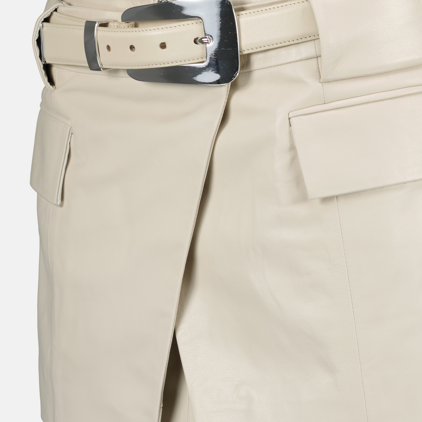 Introducing the Yori leather skirt in beige, a sophisticated addition to your wardrobe. This short-cut piece showcases an adjustable leather belt for a perfect fit, complemented by a logo patch on the tab. Crafted from soft lambskin, the removable upper adds versatility to your outfit. With flap pockets for added convenience, this skirt effortlessly blends style and practicality, making it a must-have for the Spring-Summer 2025 collection.